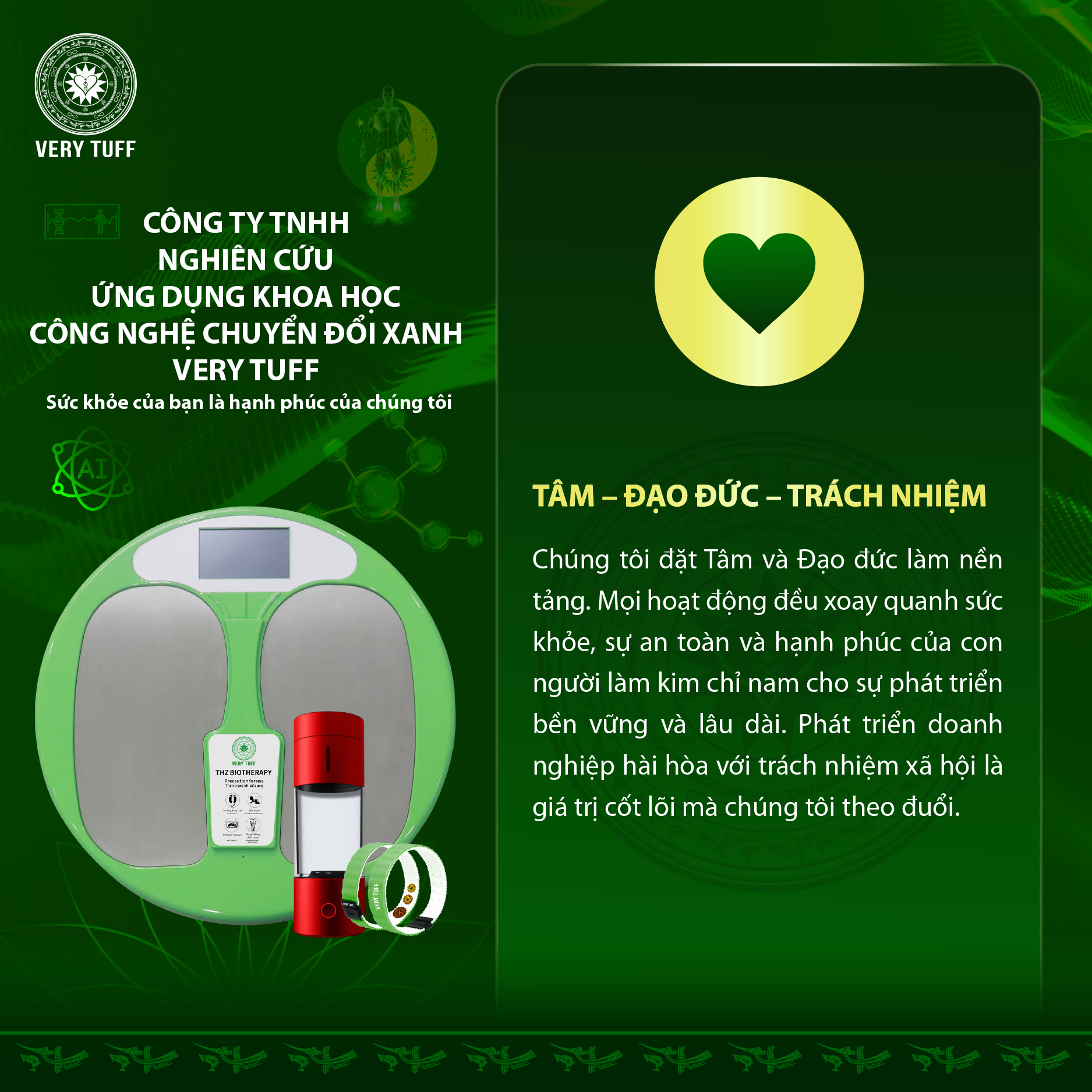 Very Tuff tin rằng sức khỏe là tài sản vô giá, là gốc rễ của một cuộc sống hạnh phúc và thành công. Với triết lý đặt con người làm trung tâm, chúng tôi cam kết mang đến những giải pháp chăm sóc sức khỏe an toàn, hiện đại và bền vững – vì một cộng đồng khỏe mạnh, một tương lai thịnh vượng.